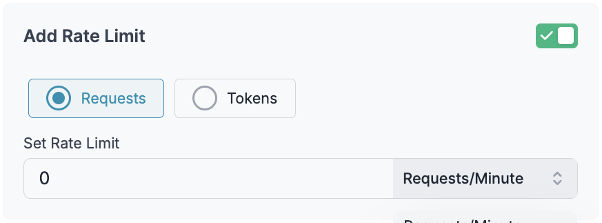 Rate Limits lets you set request or token consumption limits on virtual keys